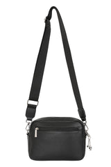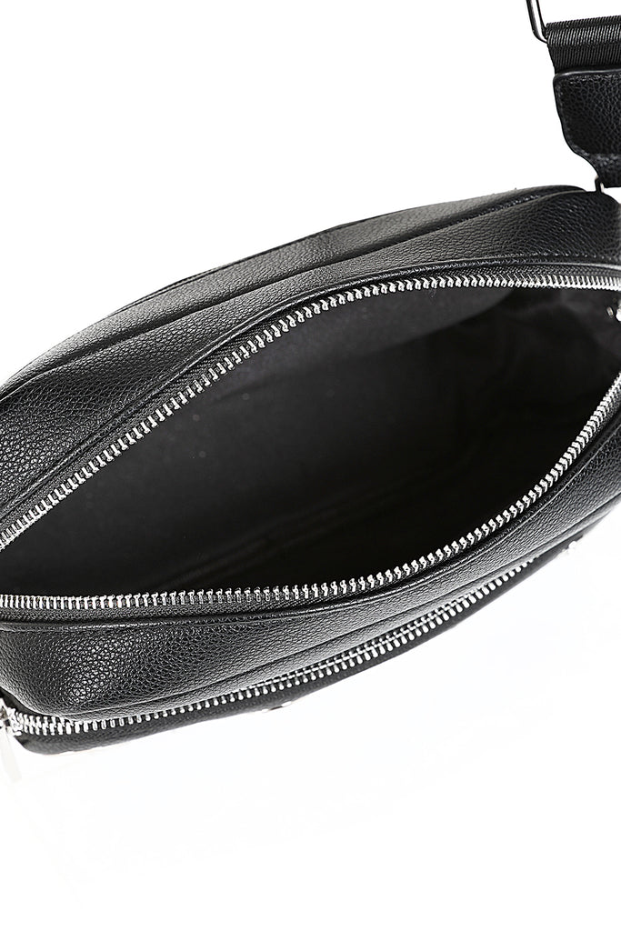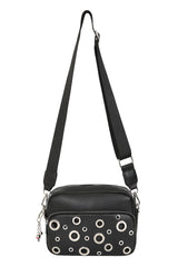 The Metal Moon Shoulder Bag is a stylish compact crossbody featuring eyelet details, a zipped pocket, and charms. It comes with an adjustable woven strap, perfect for everyday wear.