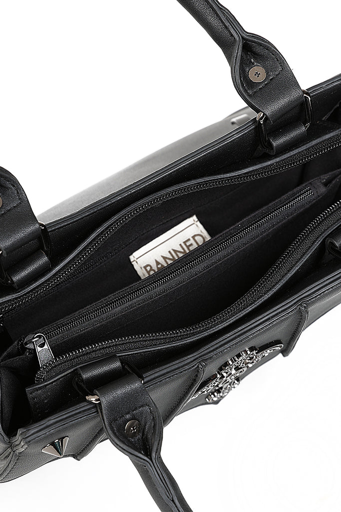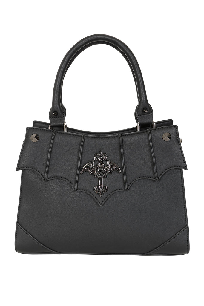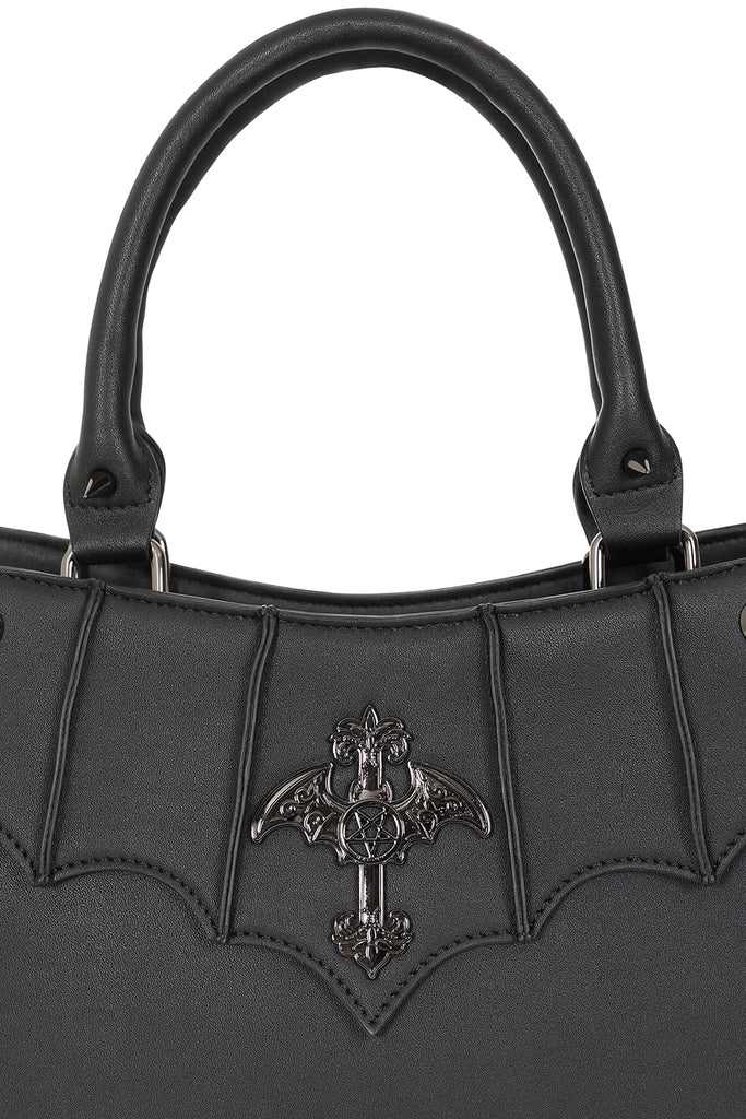anned Medium-sized vegan leather handbag featuring an ornate gunmetal cross with pentagram detail. This gothic-inspired bag includes bat-wing styled panels, an adjustable shoulder strap, and detailed stitching. Perfect for dark alternative fashion enthusiasts.
