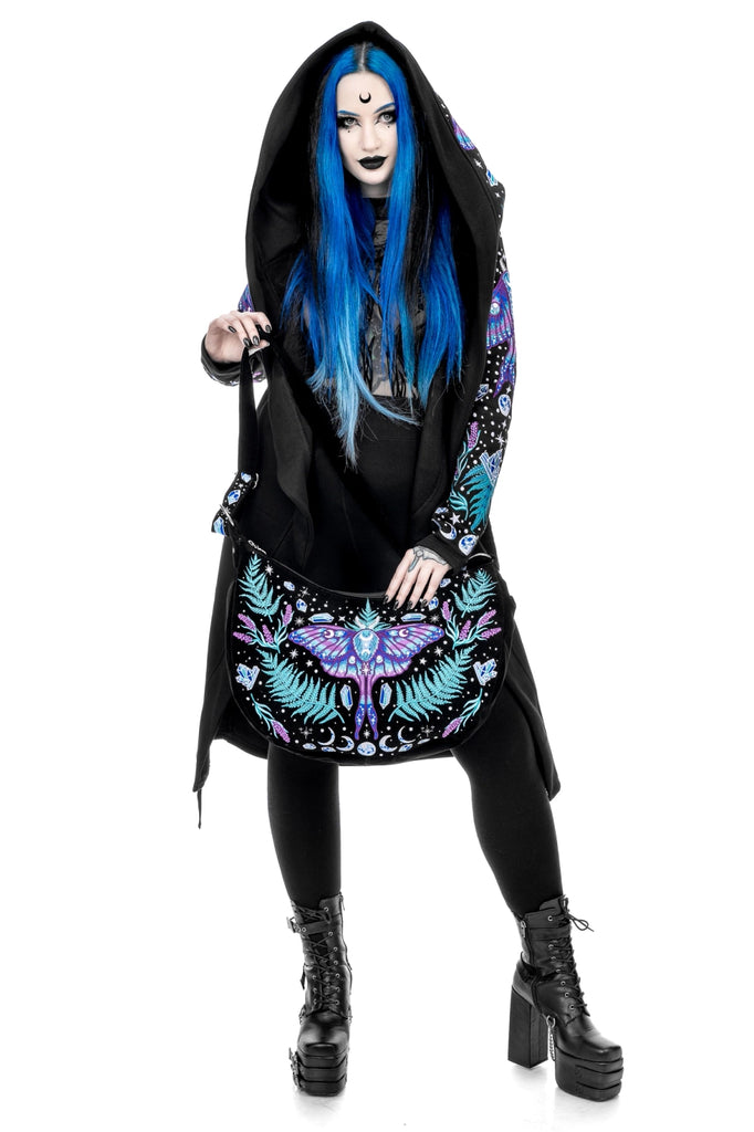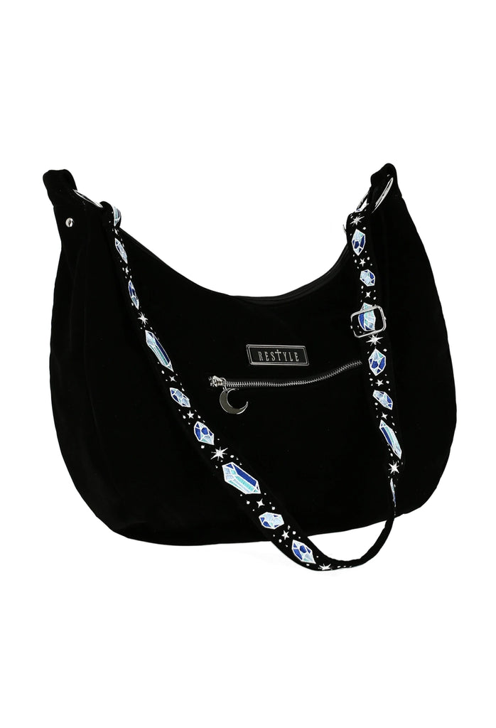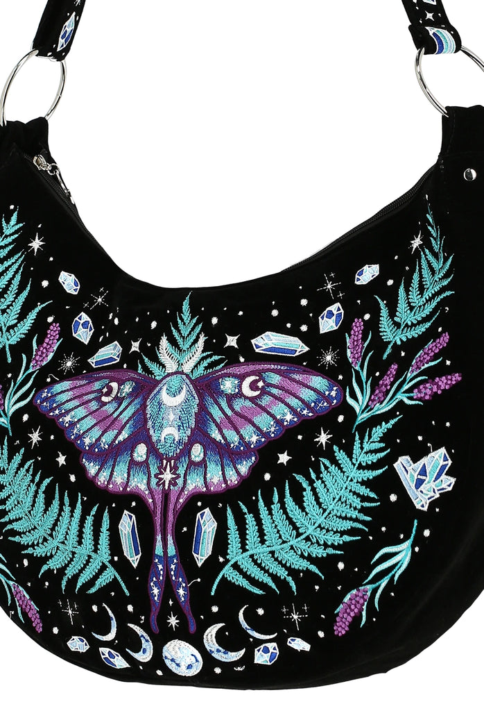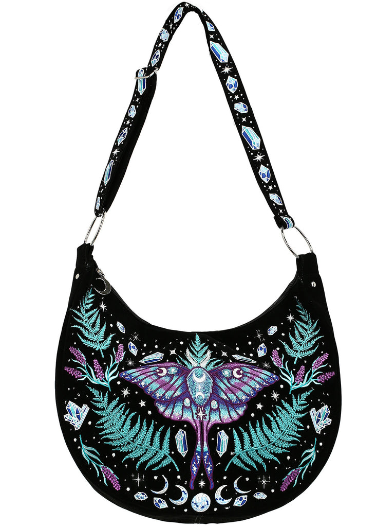 This gothic hobo bag is not just a visual feast; it's also incredibly spacious, capable of harboring all the secrets of the enchanted forest. Open it up, and you'll discover an additional compartment, a sanctuary for organizing your belongings. A back zip pocket adorned with a silver crescent will harbor all your little secret spells. The shoulder bag comes complete with a comfortable, adjustable strap adorned with crystals, ensuring both style and practicality in your enchanted adventures.
