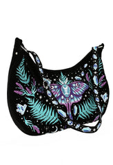 Behold the singular creation that is the Restyle bag, a masterpiece of intricate embroidery. At its heart, akin to a precious jewel, is a mystical moth whose wings shimmer in hues of purple, pink, and blue. Embroidered crystals, moon phases, and stars scatter across the embroidered bag's surface, delicately twinkling like celestial storytellers recounting mysteries of the night. And of course, our signature fern leaves couldn't be omitted!