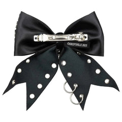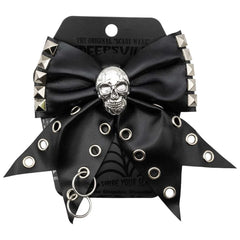 Add some undying style to your hair with Kreepsville's Skull Punk Stud Hair Bow! Made of vegan leather with punk inspired studs, O rings, and centerpiece skull this bow is perfect for scaring up some compliments. Fastened with a large sturdy metal barrette that ensures this bow isn’t going anywhere—even if you’re raising hell on the dance floor. Clip length approx 3" (7.6 cm), bow size approx 5.5" (14cm) x 6" (15.2cm).
