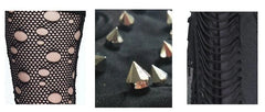 With it’s distressed mesh panels on thighs and flared hem that is covered with lace, this pants is a perfect fusion of 60s and gothic fashion!The knees are sprinkled with bronze metal studs and the elastic threads that are sewn right after them end at shins.Due to it being mainly...