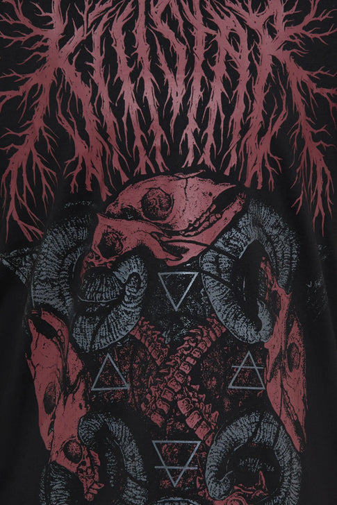 Long sleeve mesh top with cold shoulder cut out and chest cut out. Featuring gross grain and metal O ring arm bandage detail and studded neck strap.