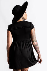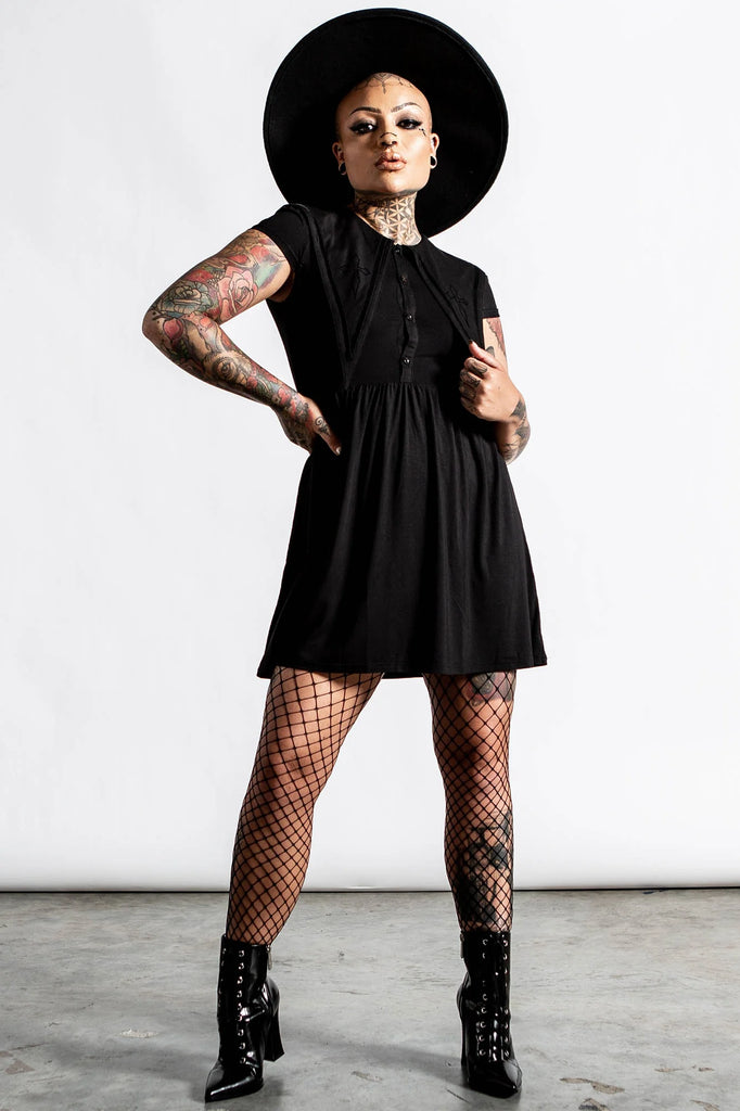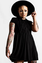 Which sin did you commit today? Make everyone else envious in our 'Blood Bound' skater dress; conjured using a luxe soft-touch fabric which stretches to perfection for a comfortable yet flattering fit. No detail has been spared - features an exaggerated collar with crosses, button-up panel on the chest and short sleeves. A sinful statement piece to transcend yer look - bound to make even the dark lord take notice.