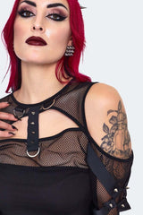 Long sleeve mesh top with cold shoulder cut out and chest cut out. Featuring gross grain and metal O ring arm bandage detail and studded neck strap.