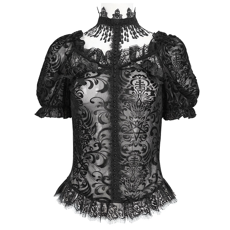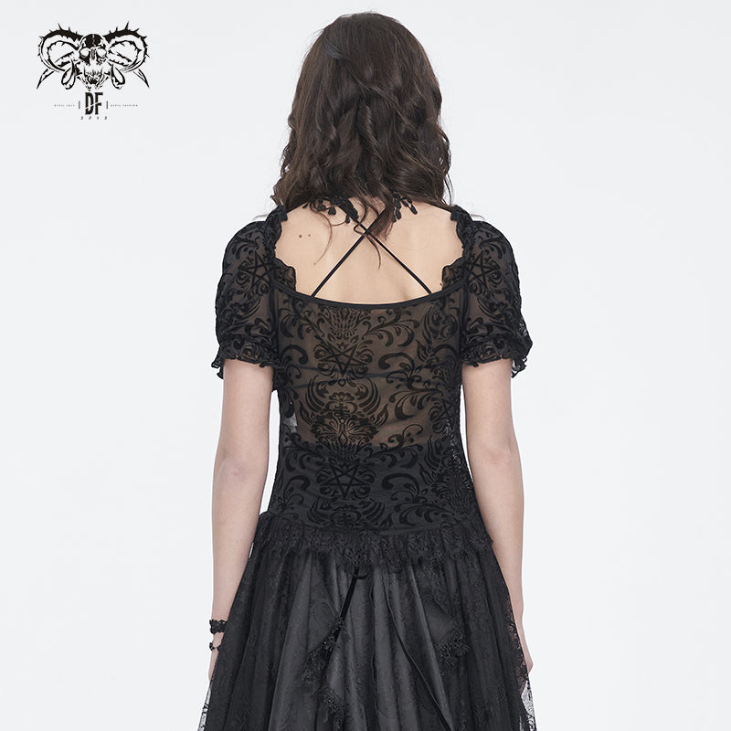 Gothic pentagram flocked mesh with lace halterneck women's short T-shirt