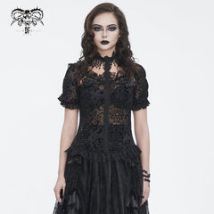 The main material is velvet, mesh material is used on the shoulders, and Gothic patterns are flocked on the chest.