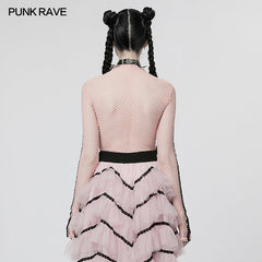 Gothic Fishnet Long Sleeve Punk T-Shirt Zippered Design- Pink