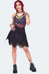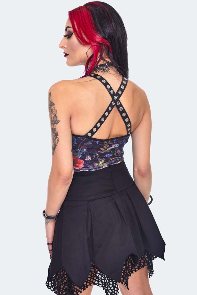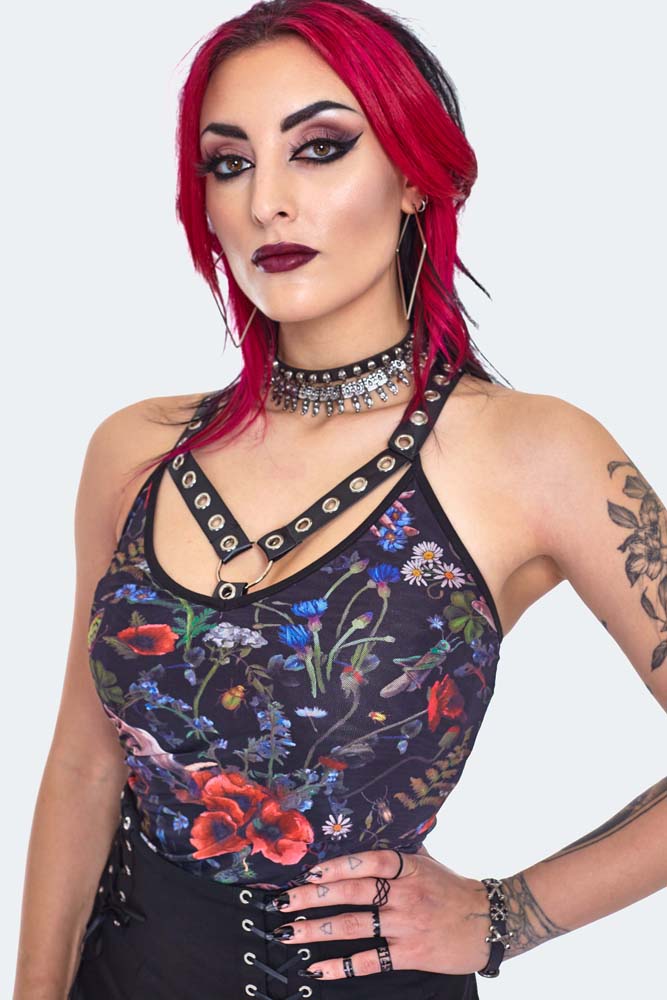 Night meddow flower printed mesh cami top with a deep neckline, metal O ring detail and eyelet embellished PU straps.