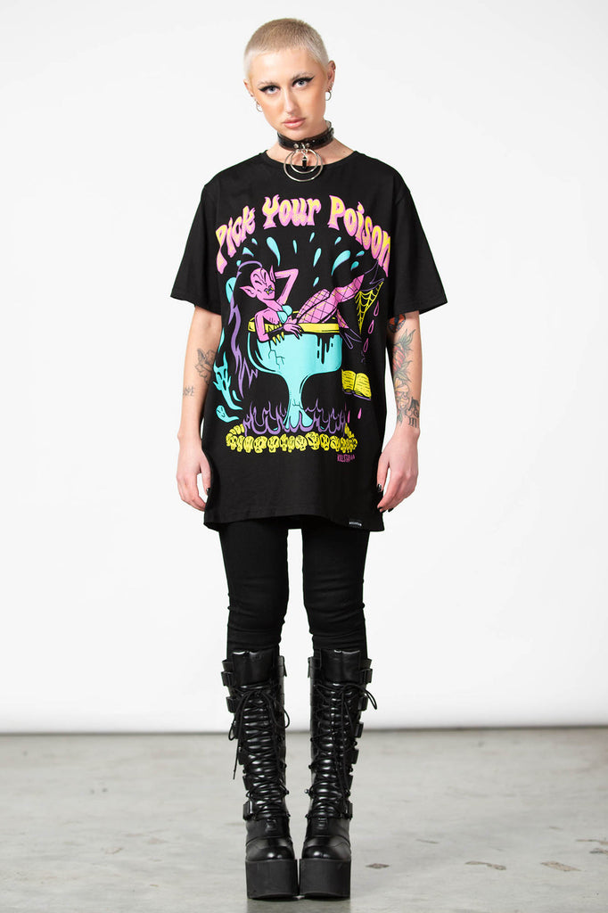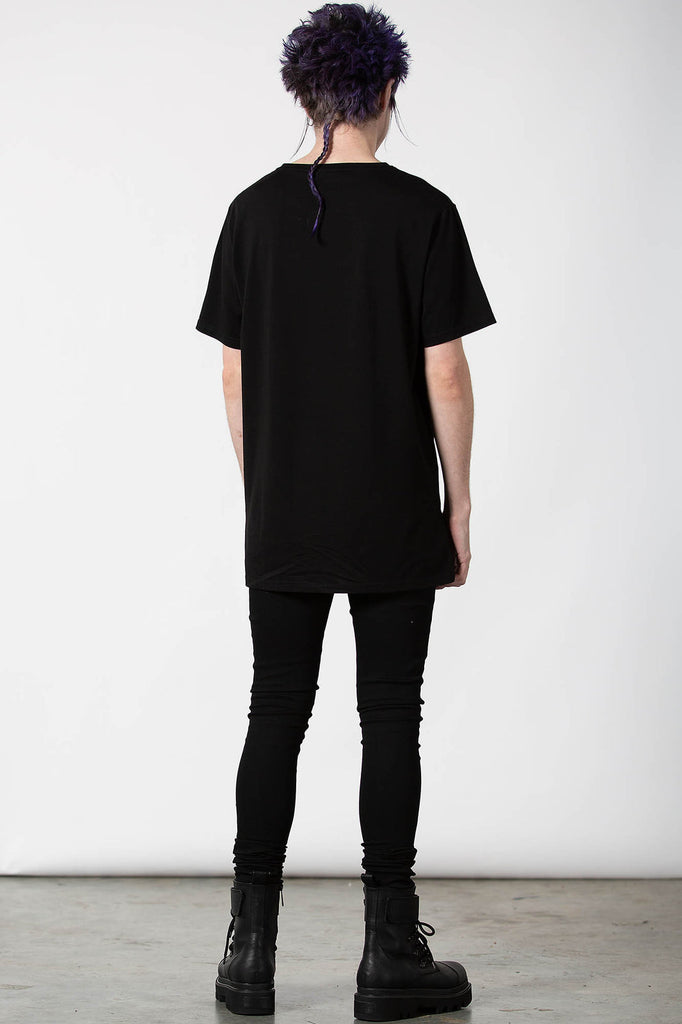 Brighten your day with our ‘Coven of kindness’ short sleeve top. Crafted in soft jersey fabric with a bound crew neck, short sleeves and finished with a large statement graphic on the front. A staple in any dark wardrobe.