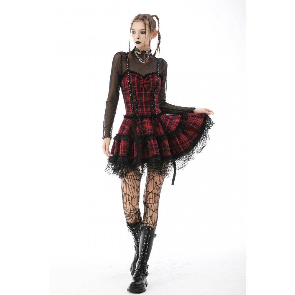 Punk studded plaid layered mini strap dress