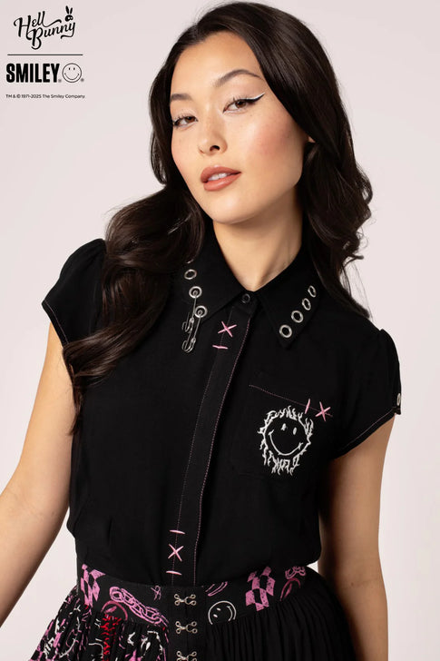 ย Vintage circus printed flared mid length dress with short sleeves, a tie neck ruffle collar and a round buckle removable waist belt.
