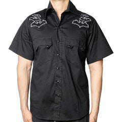 Add some spooky flair to your wardrobe with the Kreepsville Harlock X Bone Western Shirt! This gothic western essential has been embellished with a darker, edgier style thanks to an embroidered harlock skull and crossbones on the front and back. Crafted from a cotton poly blend fabric with short sleeve detail for maximum comfort and breathability, this shirt is detailed with black snap buttons for an extra dose of spooky style. It's the perfect closet addition to any gothic western wardrobe or a touch of edgy rock 'n' roll!