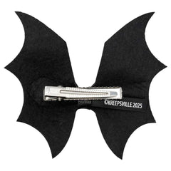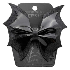 Are your hairstyles looking a little dead? Revive them in true vamp style with Kreepsville's Batwing Black PVC Hair Bow. This batty bow has a batwing inspired silhoutte made with a contrast gloss and matt PVC material for fang-tastically fierce scare-cessory. Fastened with a durable metal alligator clip so you can add some crypt-chic style to any hairstyle. Clip length approx 2.35" (6cm), bow size approx 5" (12.7cm) x 4.5" (11.4cm).
