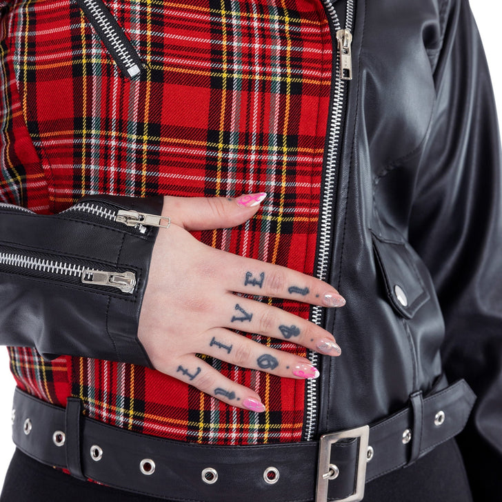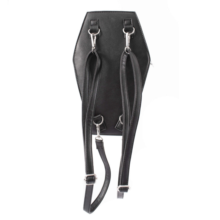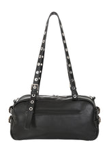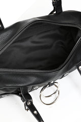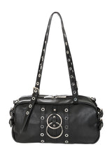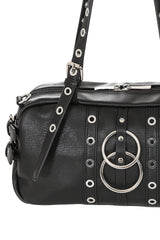 Edgy black shoulder bag by BANNED Apparel featuring a cylindrical barrel shape with decorative double metal rings on the front panel. The bag is accented with silver grommet/eyelet details along the straps and front panel. Made from vegan leather material with a punk/alternative aesthetic. Includes adjustable shoulder straps and top zipper closure. This BANNED design combines industrial hardware elements with a sleek silhouette, making it suitable for gothic, punk, or alternative fashion looks.