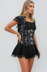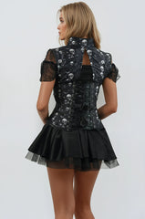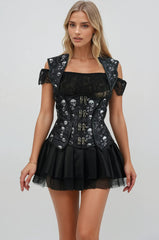 Crafted from digital printed taffeta fabric, this Underbust Corset with Lapel Halter Strap captures bold gothic elegance with its striking skull and floral motifs. The smooth, lustrous taffeta surface enhances the depth of the dark print, giving it a sophisticated sheen that balances edge with refinement. Each element of the print adds a touch of intrigue and artistry, making it a standout piece for statement styling.