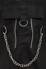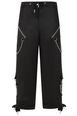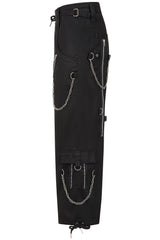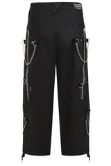 These Banned alternative black trousers have a striking design that combines edgy and utilitarian elements. They feature wide legs with mesh panels on the thighs, framed by diagonal fabric overlays adorned with metal rivets for a bold industrial look. A detachable strap with silver hardware, including metal rings and a clasp, adds a utilitarian touch, hanging stylishly from the waistband. The high-waisted design includes a button closure and belt loops for a secure fit. These trousers blend statement details with functional accents, making them a standout piece in alternative fashion.