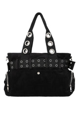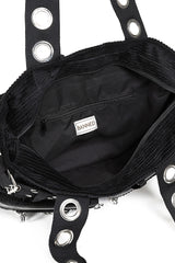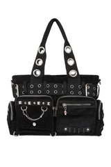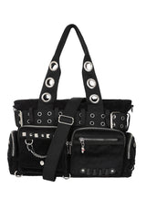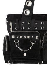 Gothic black corduroy Banned Apparel handbag featuring eyelets, studs, and decorative handcuff. Multiple zippered pockets, detachable shoulder straps, and sturdy handles with metal grommets make this edgy Banned purse both stylish and functional. Perfect for alternative and punk rock fashion.