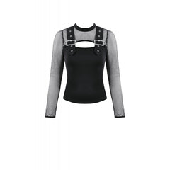 Punk Knitted Top with Mesh Overlay and Shoulder Buckle Details