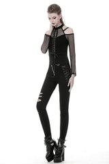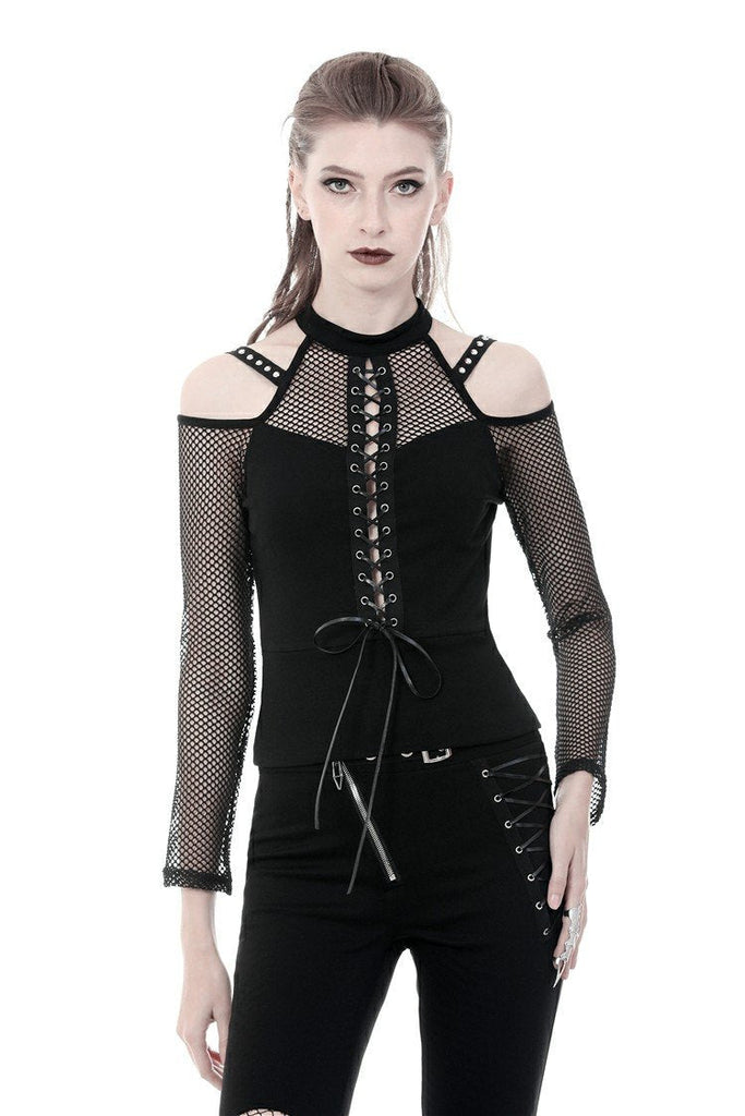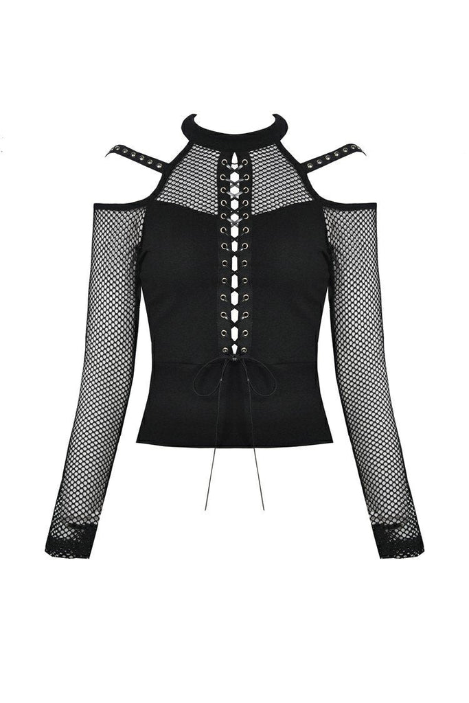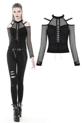 Punk lace-up front off-shoulders T-shirt with net long sleeves